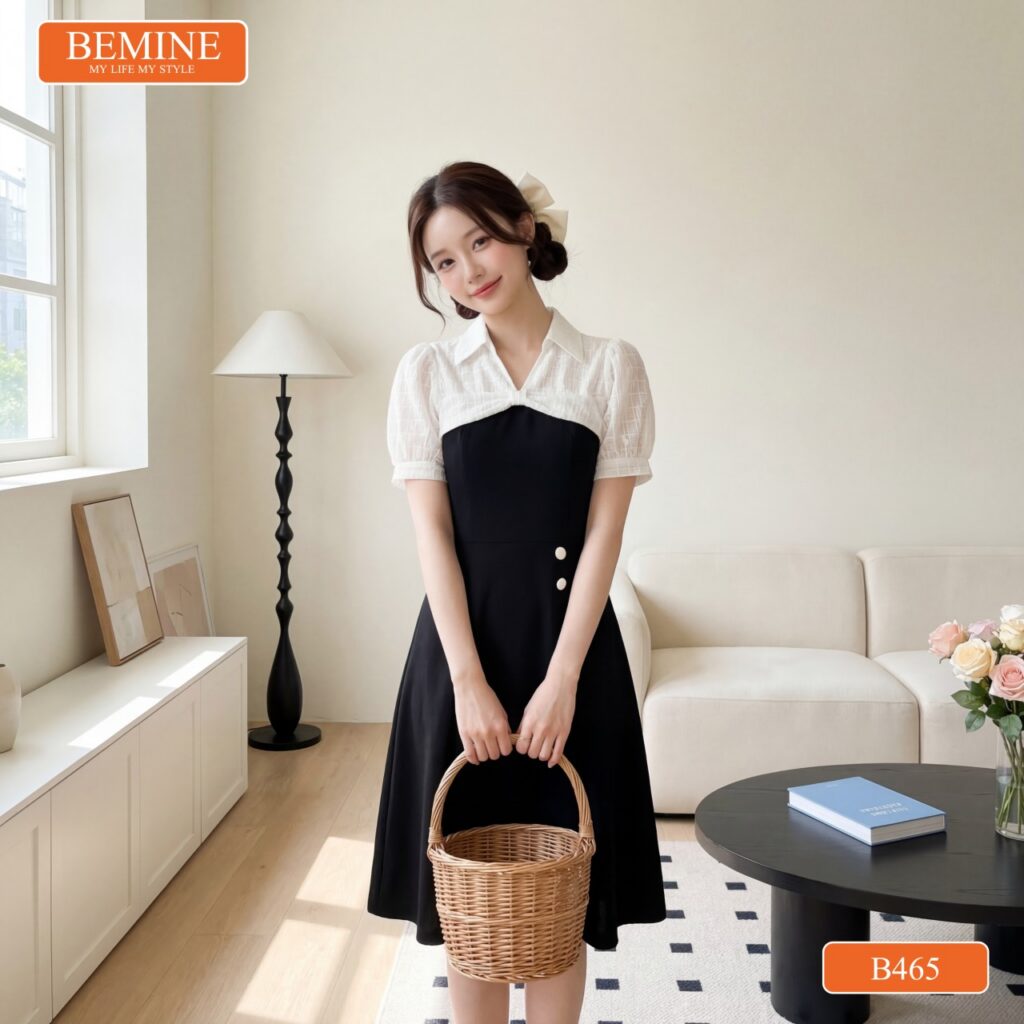- Form dáng chữ A: Giúp che khuyết điểm vùng bụng và hông cực tốt. BEMINE đã thiết kế độ xòe vừa phải, không quá rộng như các loại đầm xòe thông thường, tạo sự thanh thoát.
