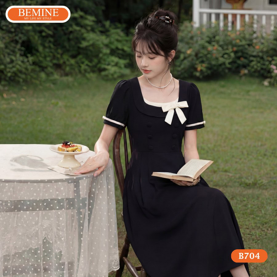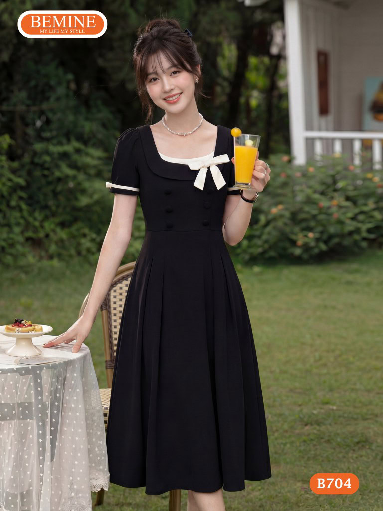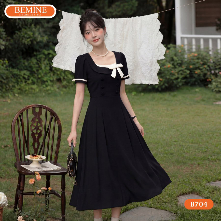 Khám phá sức hút từ đầm thiết kế BEMINE chữ a cổ vuông phối viền nơ B704