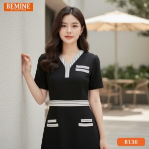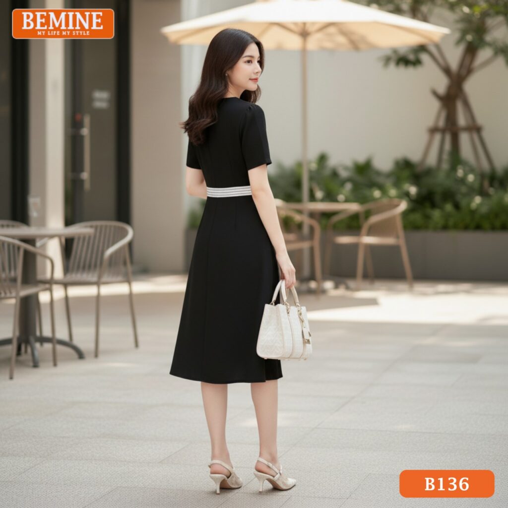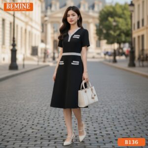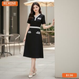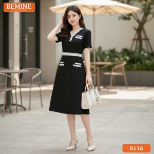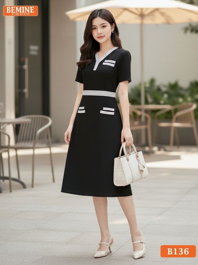 Đầm thiết kế BEMINE cổ chữ V viền sọc dáng chữ A phù hợp đi làm-B136
