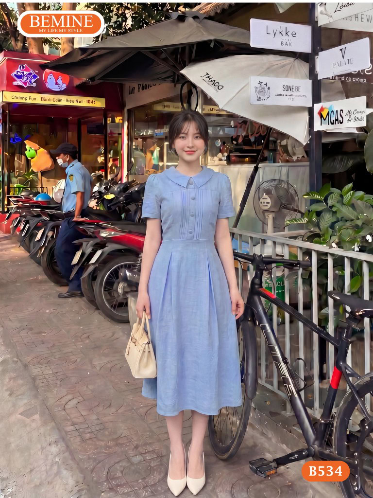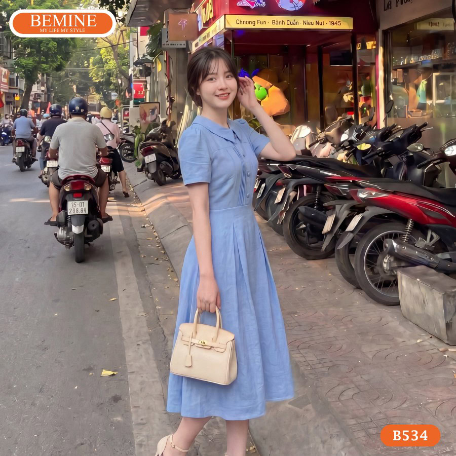 - Đi làm chuyên nghiệp: Phối cùng một đôi giày cao gót mũi nhọn màu nude hoặc trắng kem, kèm túi xách tay dáng hộp. Sự kết hợp này biến B534 thành một bộ đầm dự tiệc nhẹ nhàng cho các buổi họp mặt sau giờ làm.