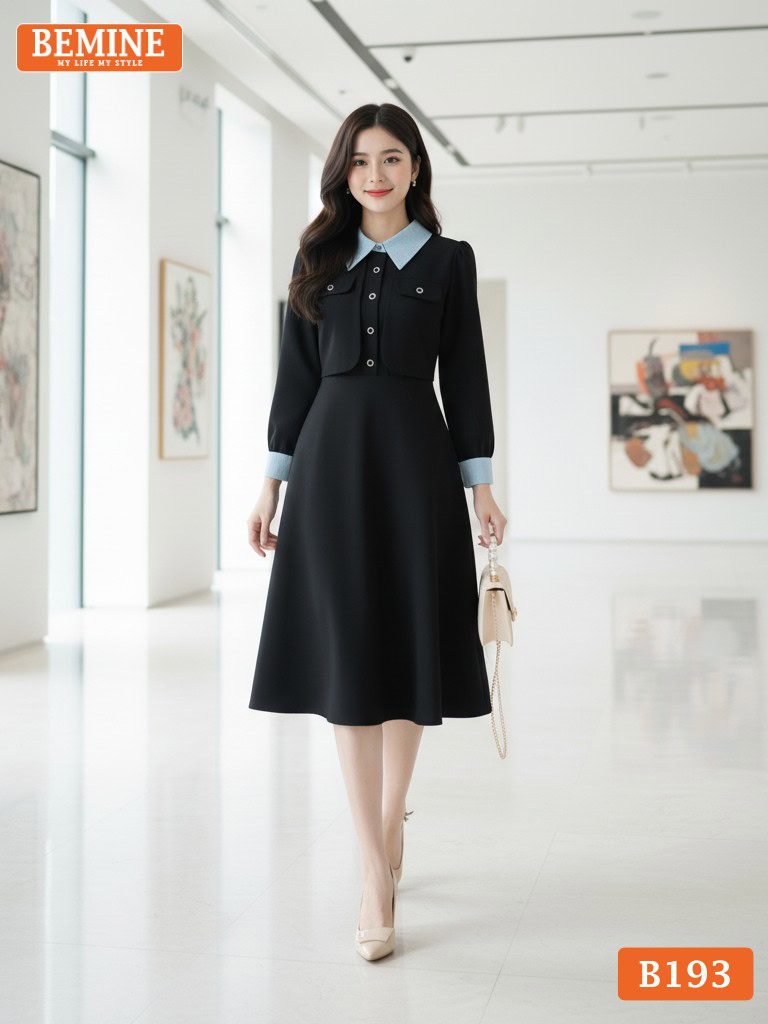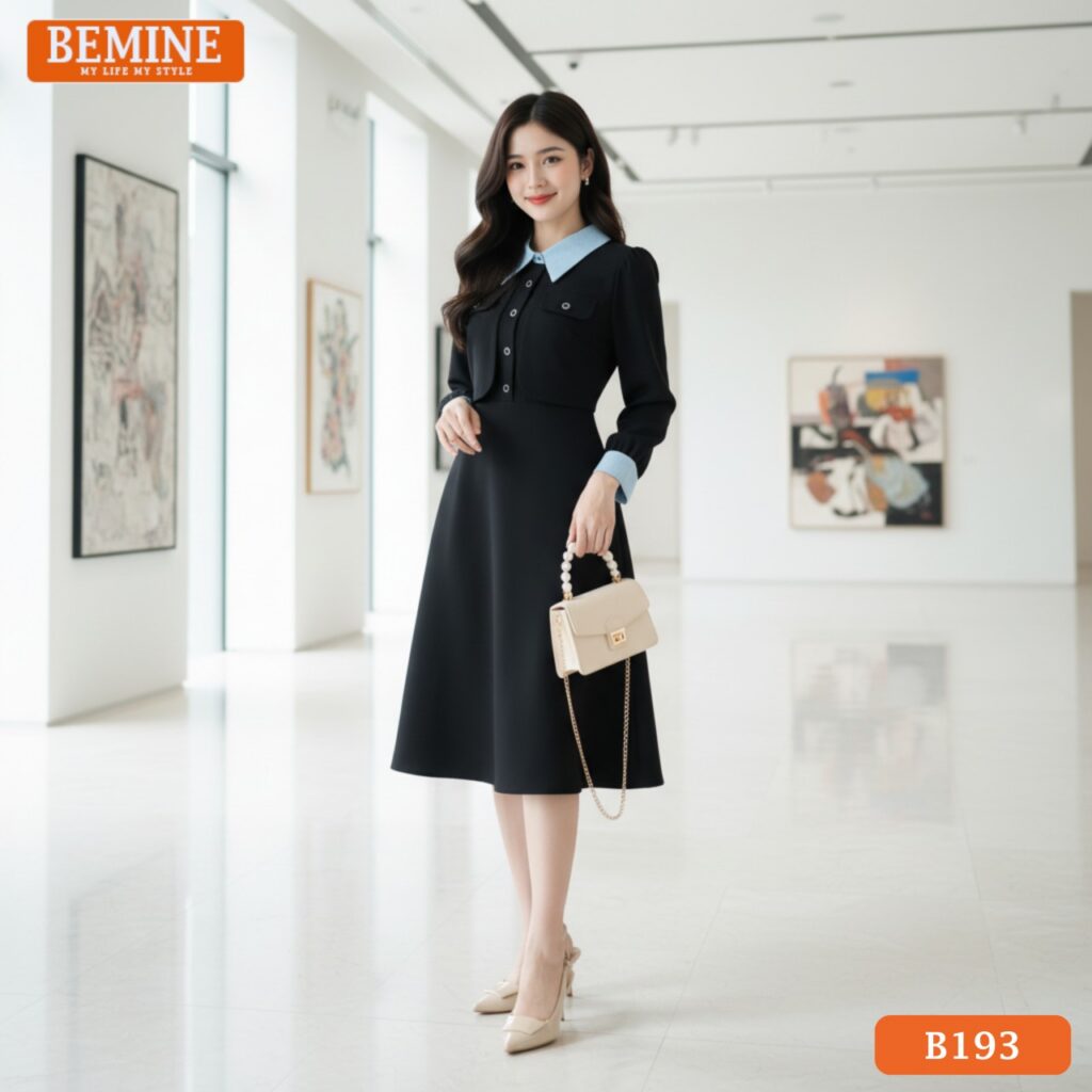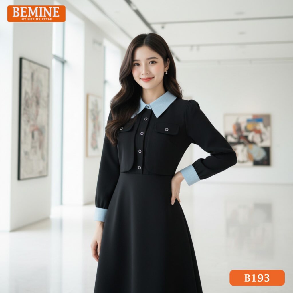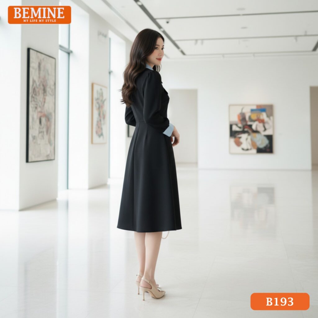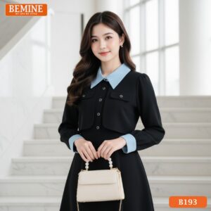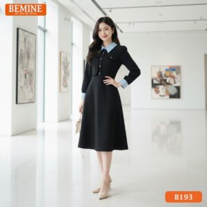 Đầm thiết kế BEMINE cổ đức phối sọc tay dài dáng chữ A phù hợp đi làm-B193