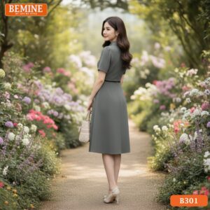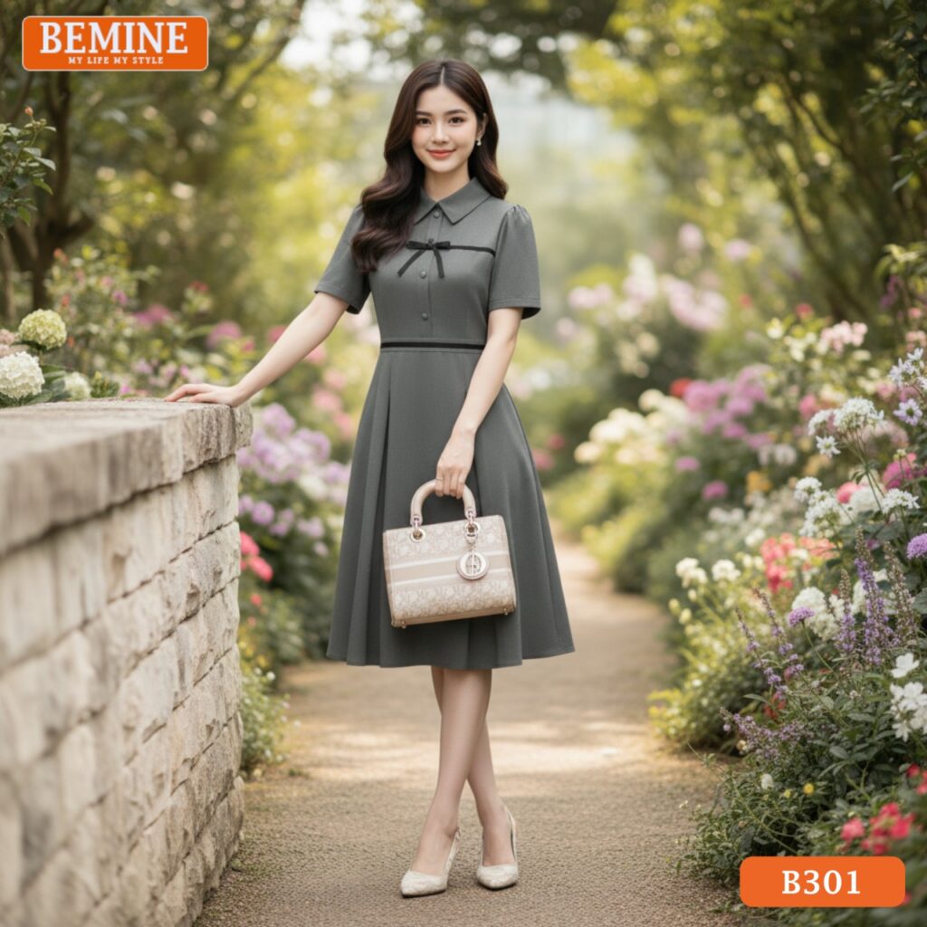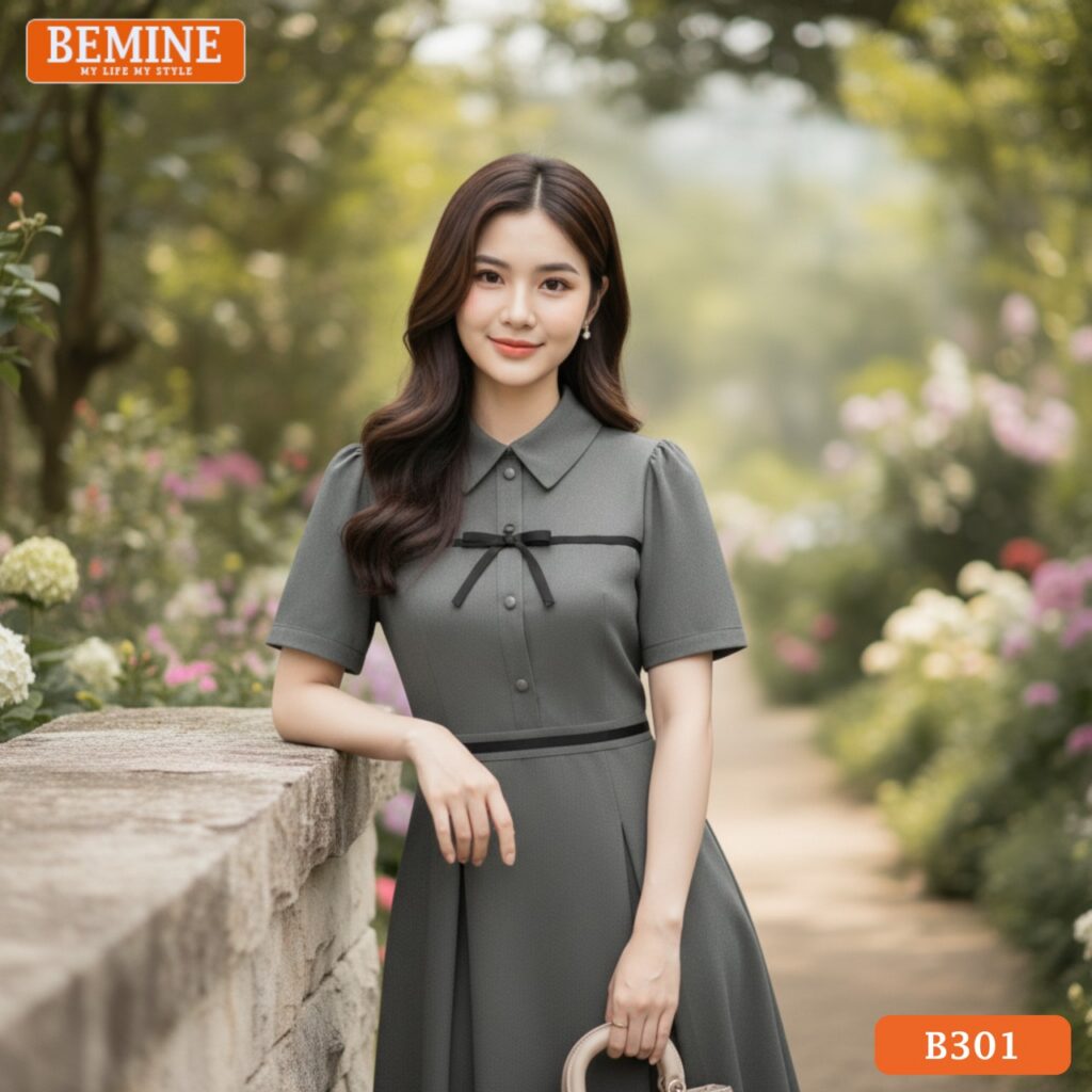 Đầm thiết kế BEMINE cổ đức phối viền nơ dáng chữ A phù hợp đi làm-B301