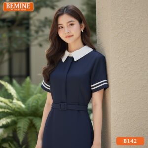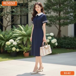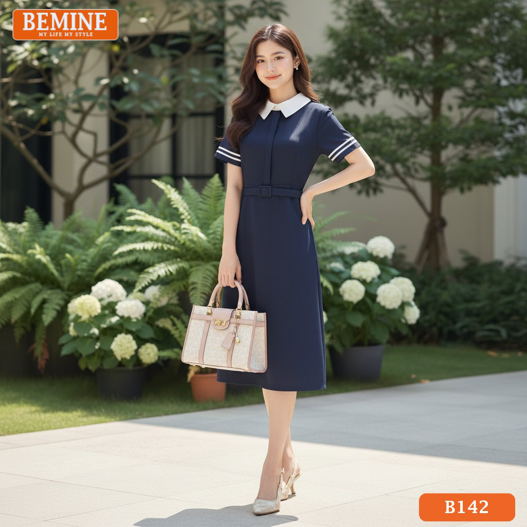 Đầm thiết kế BEMINE cổ đức tay ngắn có viền dáng chữ A phù hợp đi làm-B142