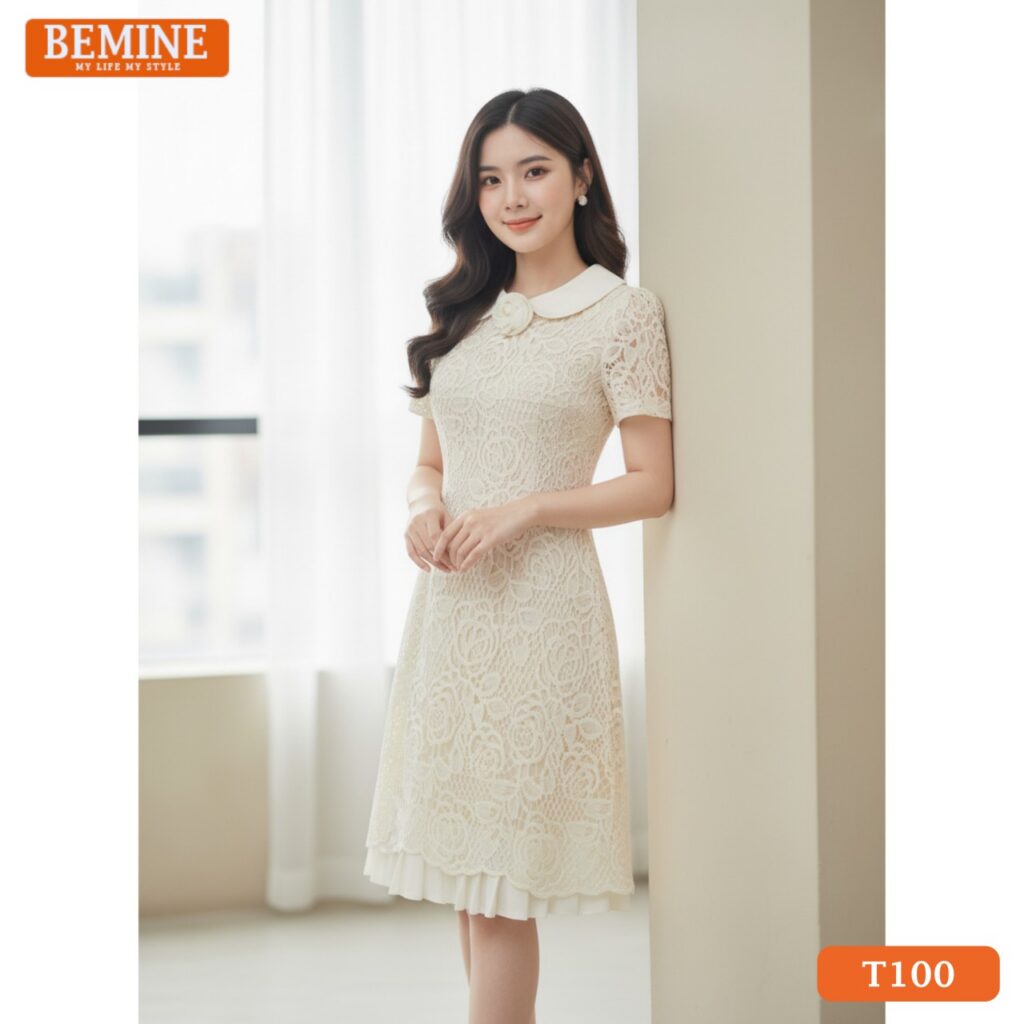 Đầm thiết kế BEMINE cổ sen ren hoa nổi dáng chữ A phù hợp đi tiệc-T100