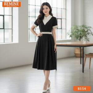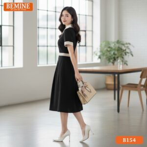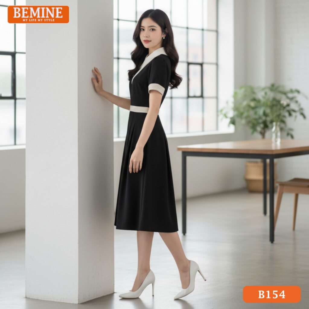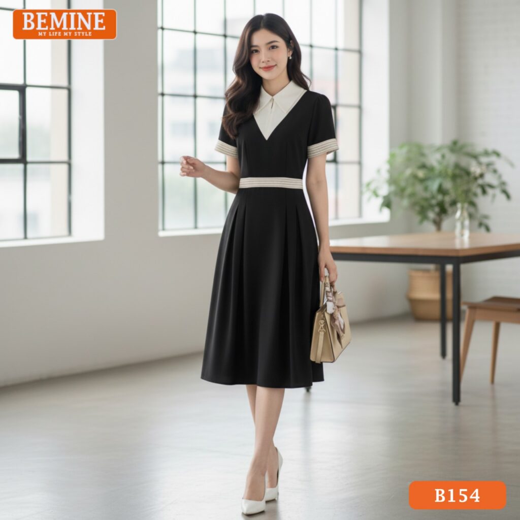 Đầm thiết kế BEMINE cổ sơ mi dây kéo trước phối viền sọc dáng chữ A phù hợp đi làm-B134