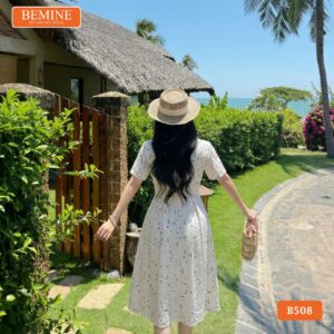- Phong cách dạo phố, du lịch: Chị có thể thay bằng một đôi sandal đế xuồng, kết hợp thêm chiếc mũ cói rộng vành. Lúc này, B508 biến hóa thành một chiếc đầm du lịch vô cùng lãng mạn và bay bổng dưới ánh nắng.
