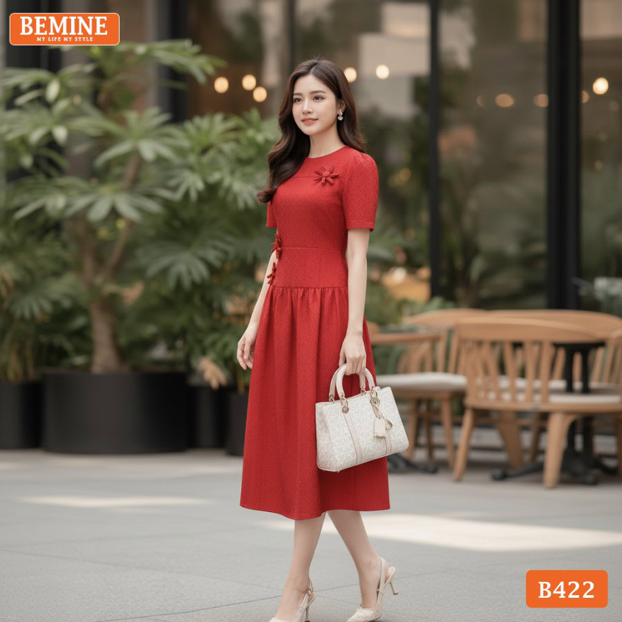 - Phong cách chuyên nghiệp: Kết hợp mẫu đầm thiết kế BEMINE cổ tròn đính hoa dáng dài B422 với một đôi giày cao gót mũi nhọn màu nude hoặc đen và túi xách dáng hộp. Đây là set đồ chuẩn mực cho môi trường văn phòng.