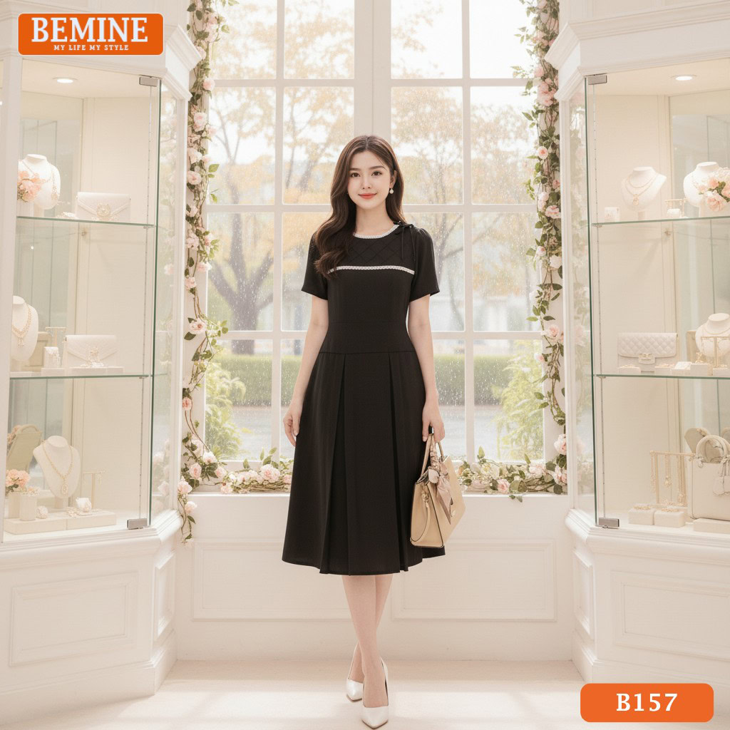 Đầm thiết kế BEMINE B157 cổ tròn vai đính nơ – Dáng chữ A thanh lịch đi làm