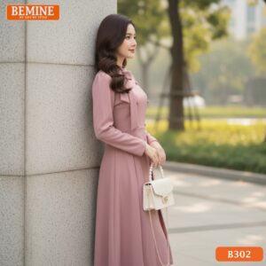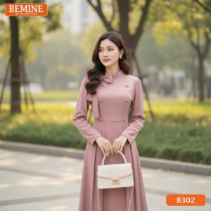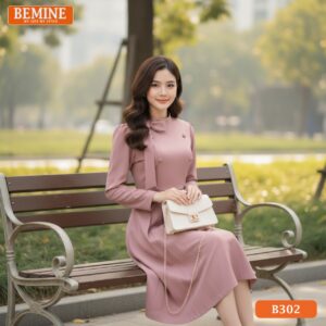 Đầm thiết kế BEMINE cổ trụ có dây nơ tay dài dáng chữ A phù hợp đi làm-B302