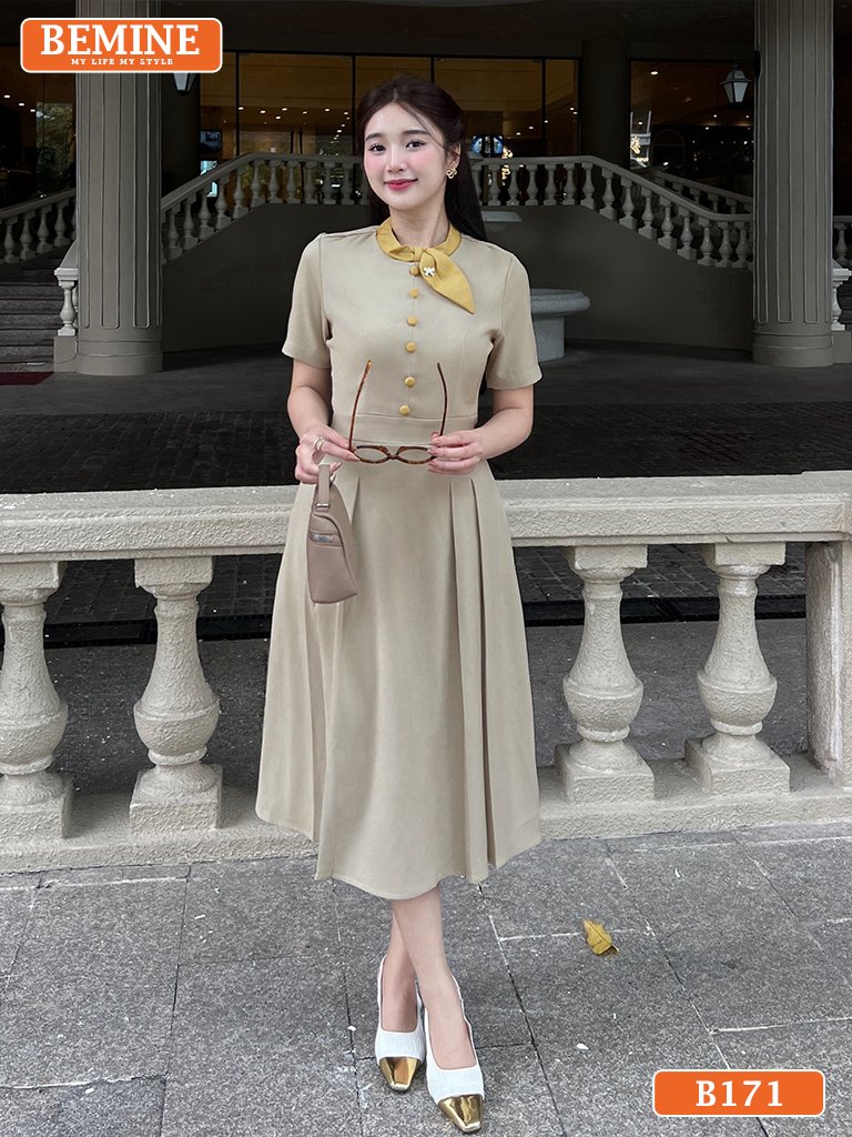 Nút giả: Hàng cúc giả được đính dọc thân đầm hoặc trên cổ áo/tay áo (tùy thiết kế cụ thể), tạo điểm nhấn thị giác thu hút. Các nút giả này góp phần tăng thêm vẻ sang trọng, cổ điển cho chiếc đầm thiết kế BEMINE cổ trụ phối viền nơ đính cúc B171.
