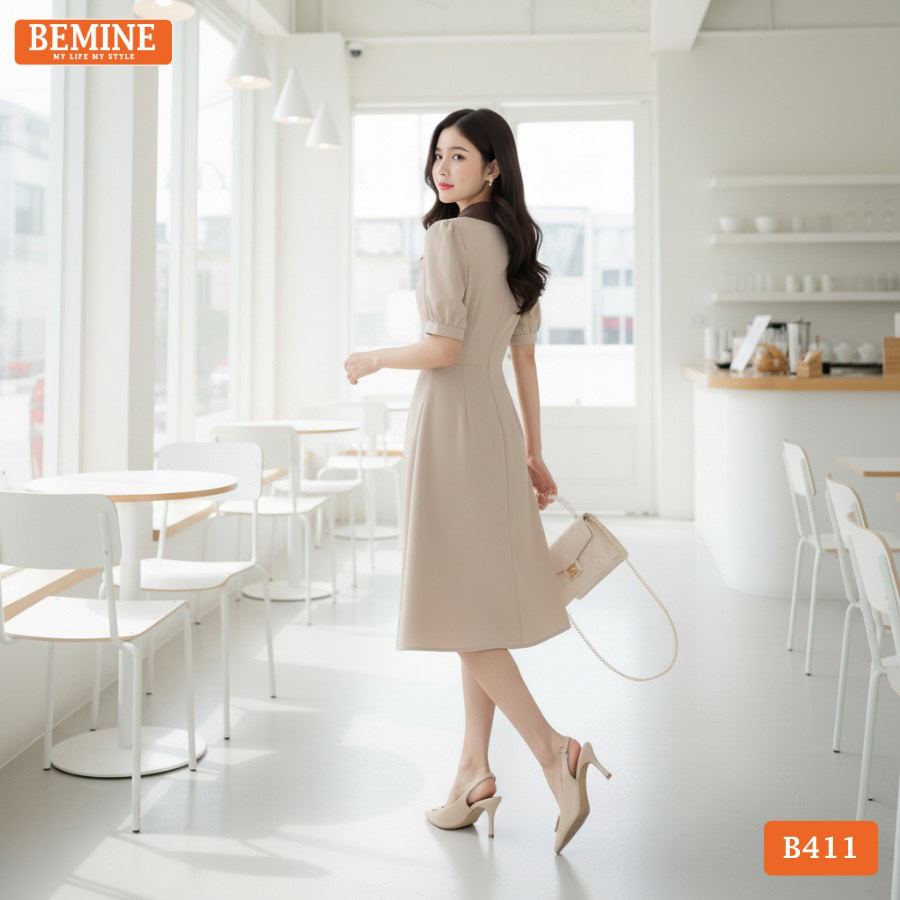 Người mẫu diện đầm BEMINE B411 dáng chữ A, phong cách thời trang công sở hiện đại và đầy cuốn hút.