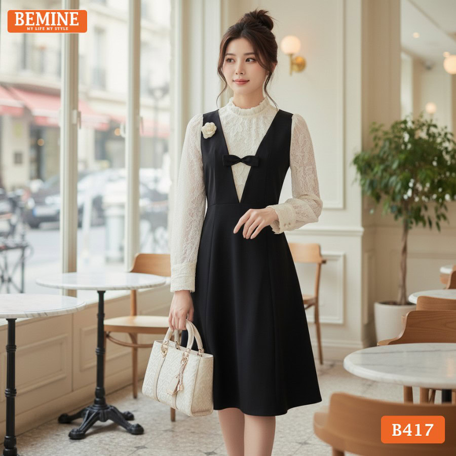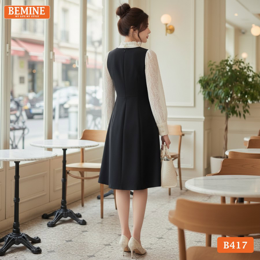 Mẫu đầm thiết kế BEMINE dáng chữ a cổ trụ phối ren hoa B417 sở hữu những đặc điểm thiết kế độc đáo, tối ưu cho vóc dáng phụ nữ Việt: