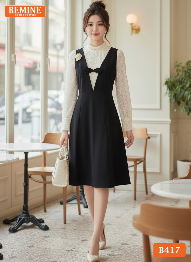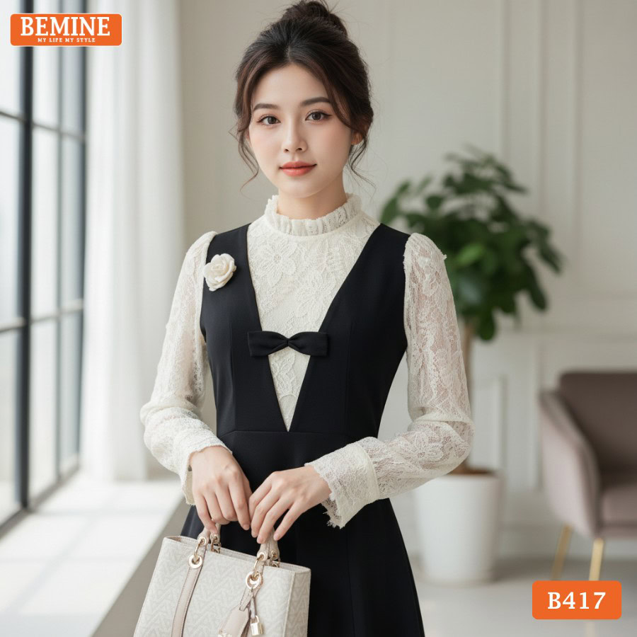 Chào chị, BEMINE rất vui được giới thiệu đến quý cô công sở một tuyệt phẩm mới trong bộ sưu tập năm nay. Mẫu đầm thiết kế BEMINE dáng chữ a cổ trụ phối ren hoa B417 là sự giao thoa hoàn hảo giữa nét kín đáo truyền thống và sự phá cách hiện đại, giúp nàng tự tin tỏa sáng.