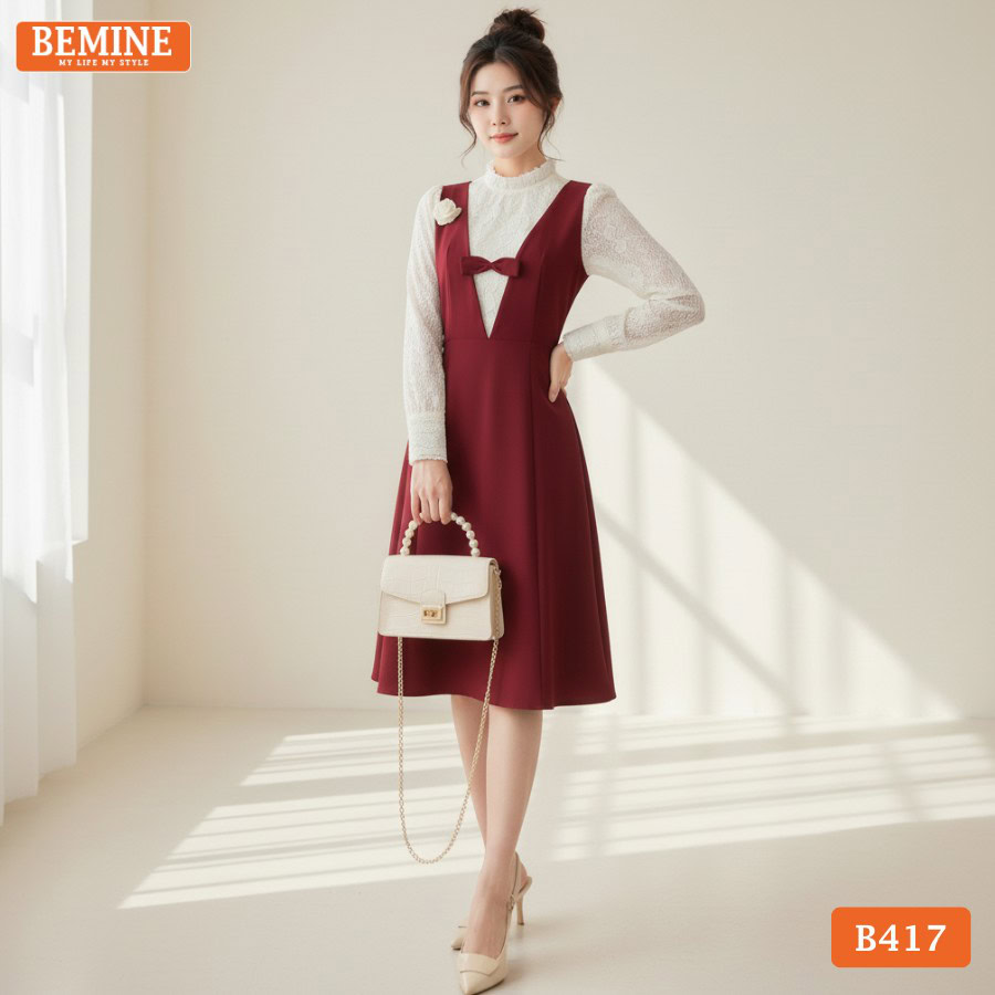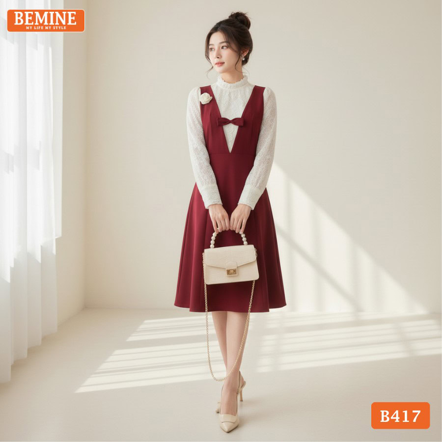 Gợi ý phối đồ cùng đầm thiết kế BEMINE dáng chữ a cổ trụ phối ren hoa B417