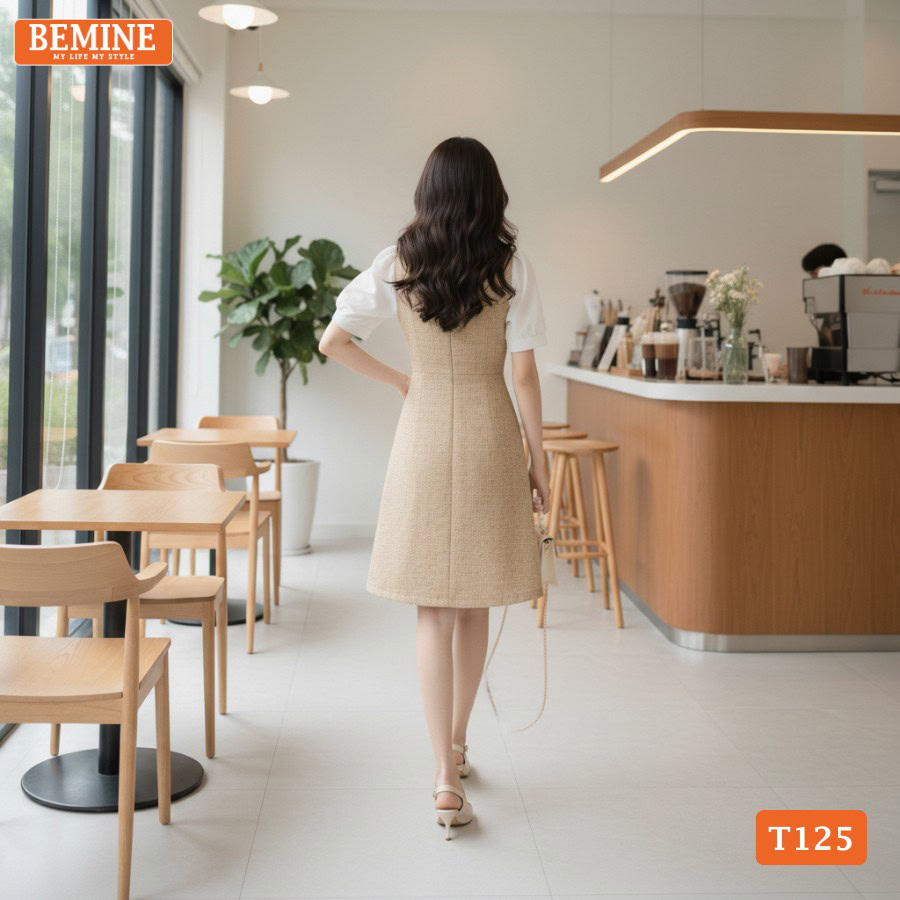 BEMINE nhận thấy rằng, các mẫu đầm chữ a phối tweed truyền thống thường có nhược điểm là chất vải hơi dày và cứng, dễ gây cảm giác nóng bức khi mặc lâu. Do đó, với mã T125 này, BEMINE đã chọn chất liệu bố xước với bề mặt vải có những đường vân dệt đặc trưng nhưng vẫn giữ được độ mềm mại nhất định.